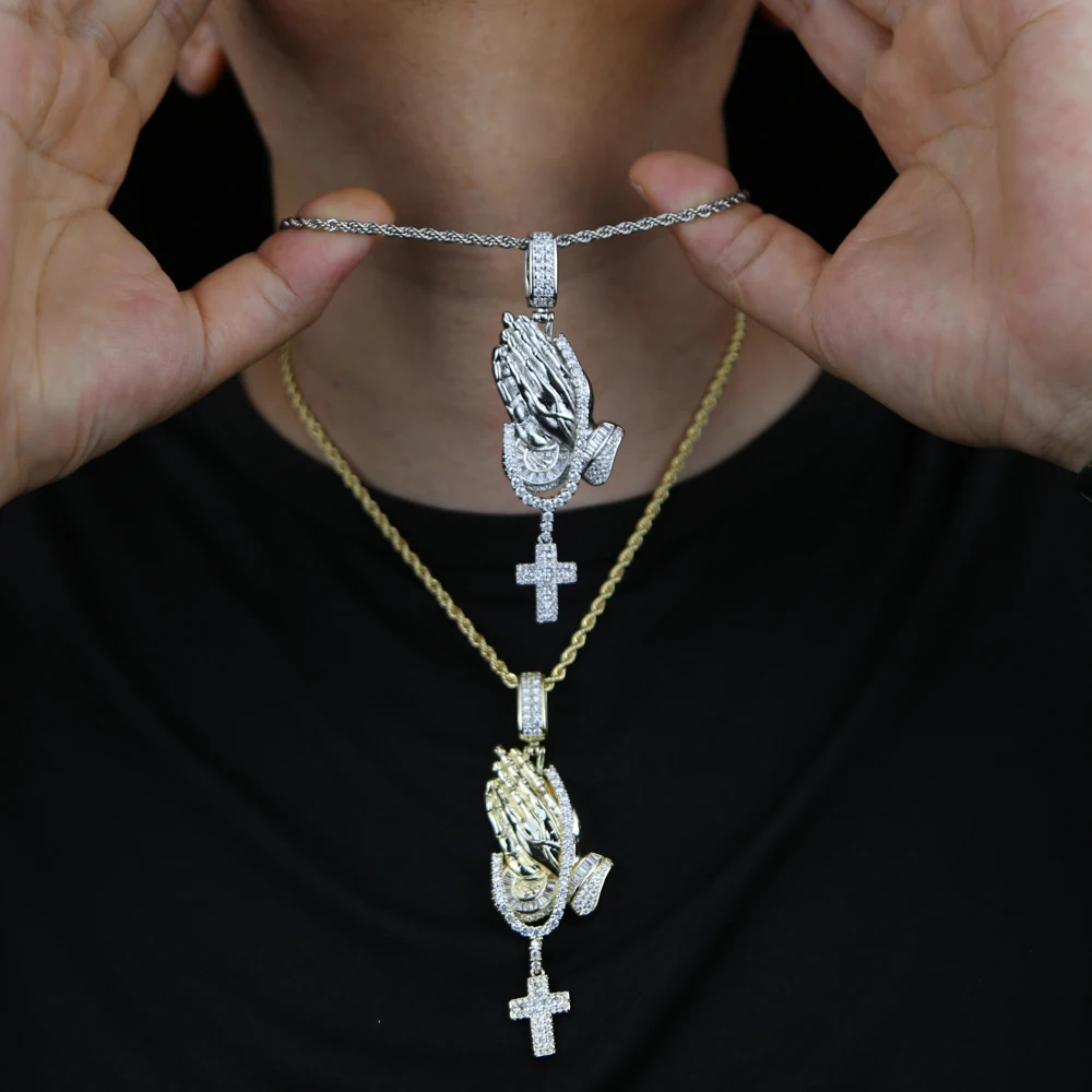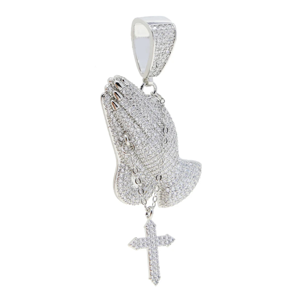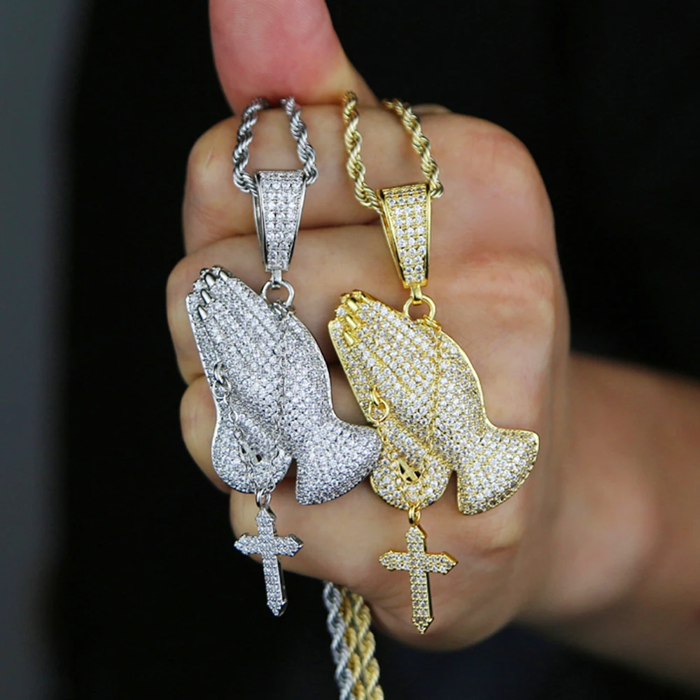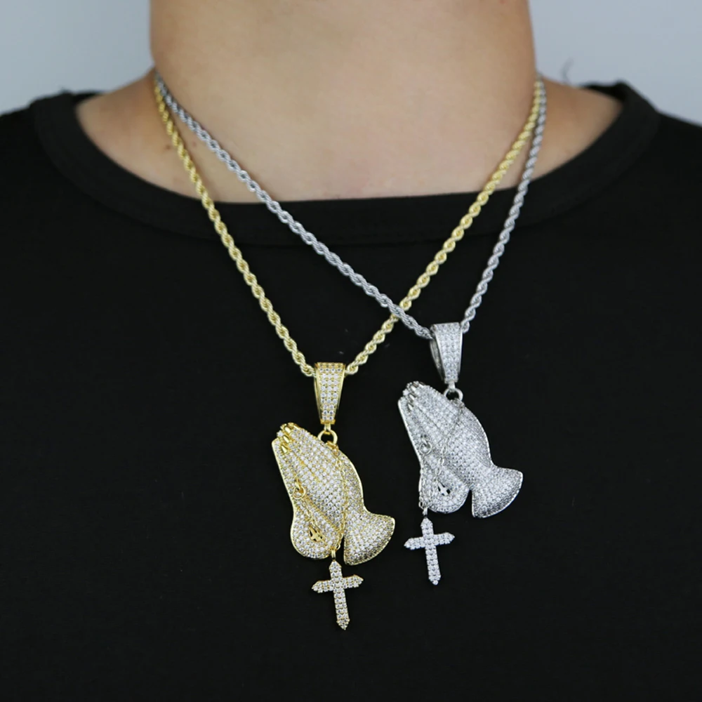 Iced Out Bling Praying Hands Cross Pendants Necklaces