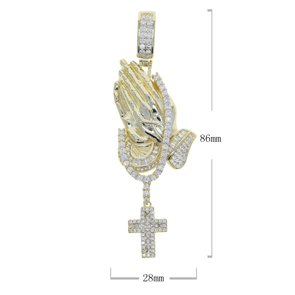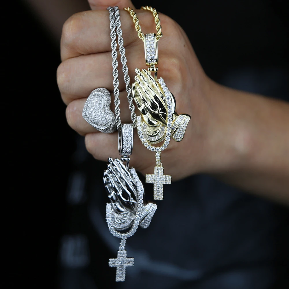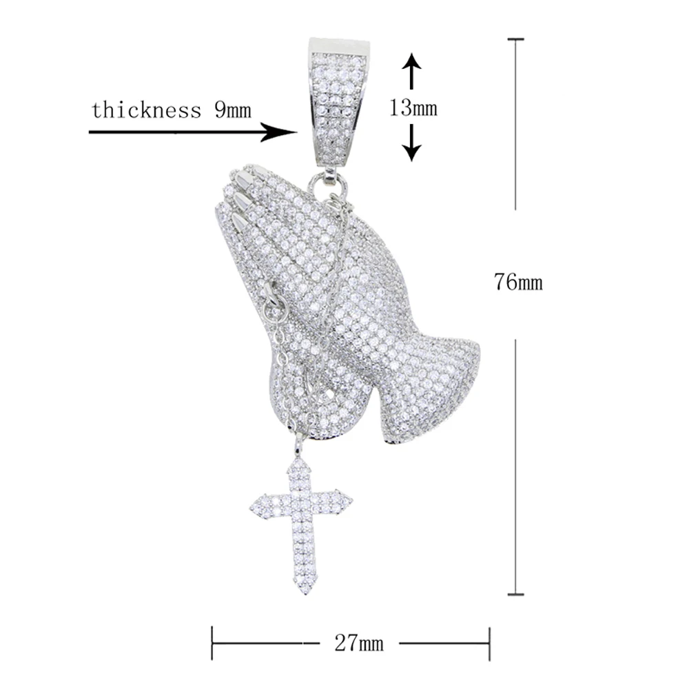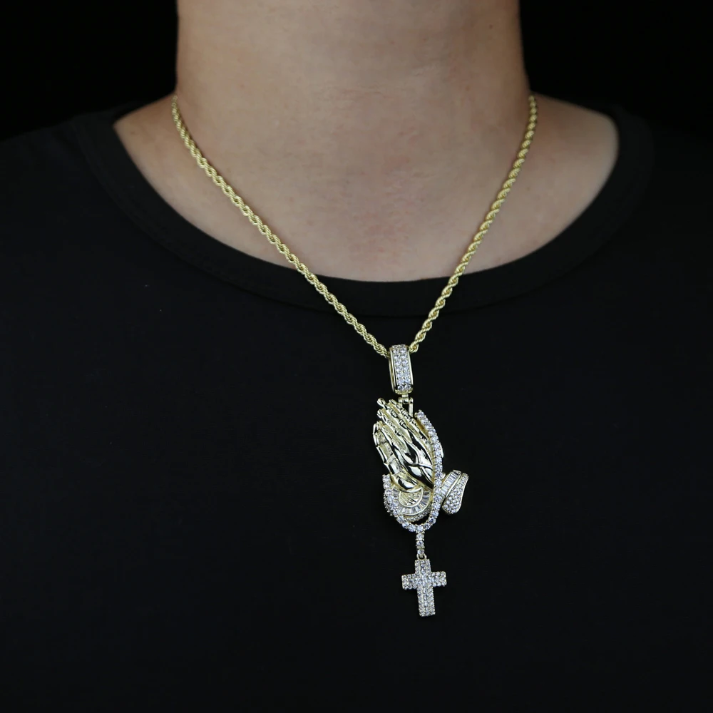 Iced Out Bling Praying Hands Cross Pendants Necklaces